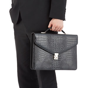 クロコダイルの鱗模様を艶やかな牛革でリアルに再現ジャバラ状に大きく開くポケットが驚きの収納力を発揮艶やかな光沢が美しい牛革に、クロコダイルの型押しを施した風格あるビジネスバッグ。